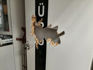 Ein großer Dank des Vereins geht an dieser Stelle an Peter Faust von der Holzmanufaktur Elz, der schnell dem Verein zur Seite stand und die zerstörten Türen sicherte und an die Familie Barbosa da Silva, die nach der Spurensicherung und Anzeigenaufnahme der Polizei Limburg das Vereinsheim säuberten und zumindest wieder begehbar machten.