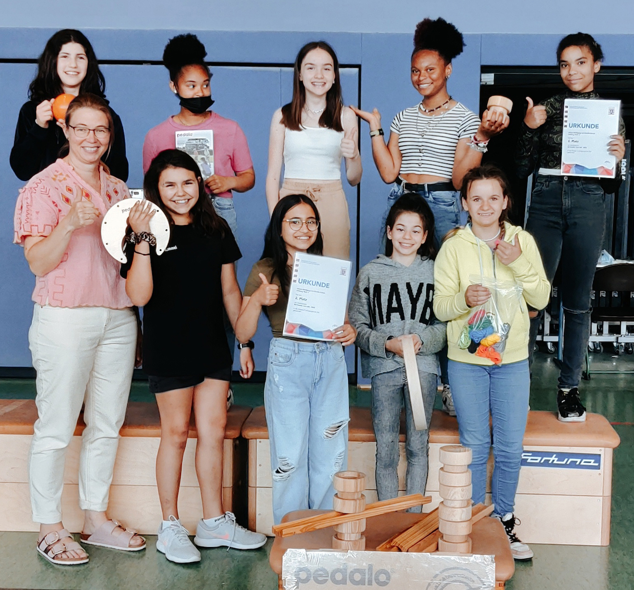 Zur Belohnung gab es neben einer Urkunde auch eine hochwertige Spielebox, die besonders die Teamfähigkeit mit vielfältig einsetzbaren kreativen Kleingeräten, fördert. Nach der Siegerehrung, die von der Schulleiterin Frau Jansing begleitet wurde, konnten die Mädchen die Aufgaben auch gleich ausprobieren. Die einhellige Meinung aller Turnerinnen war am Ende deutlich: „Da machen wir nächstes Jahr wieder mit!“