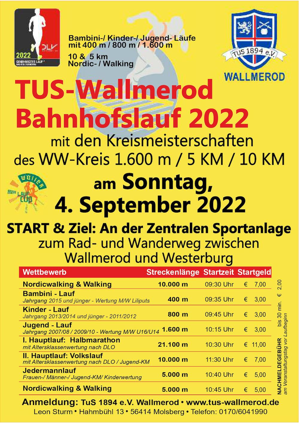 wir laden euch im Namen des Vorstandes und aller Mitglieder unseres Vereins zu unserem 30. Wallmeroder Bahnhofslauf am Sonntag, den 4. September 2022 ein.