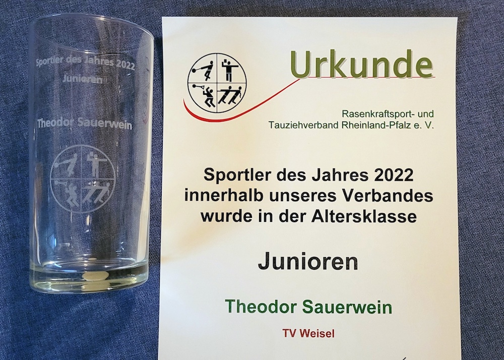 Theodor Sauerwein war 2022 der erfolgreichste Rasenkraftsportler innerhalb des Verbandes bei den Junioren und wurde daher in diesem Bereich als „Sportler des Jahres 2022“ mit einer Urkunde und einem Pfälzer Schoppenglas mit Gravur geehrt. Leider konnte er aus zeitlichen Gründen nicht am Verbandstag teilnehmen und die Auszeichnungen persönlich in Empfang nehmen.