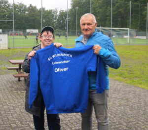von Edelfan Michael Hörter ein neues Sweatshirt überreicht. Danke an Michael Hörter und ein weiter so, Oliver Knapp. Foto: Kalli van der Burg
