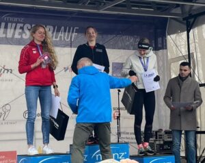 Schnappschuss von der Siegerehrung über 10 km: Mara Fladung freut sich über ihren 2. Platz aller weiblichen Starterinnen. Keine Läuferin aus dem Kreis Limburg-Weilburg war schneller als sie. Foto: privat