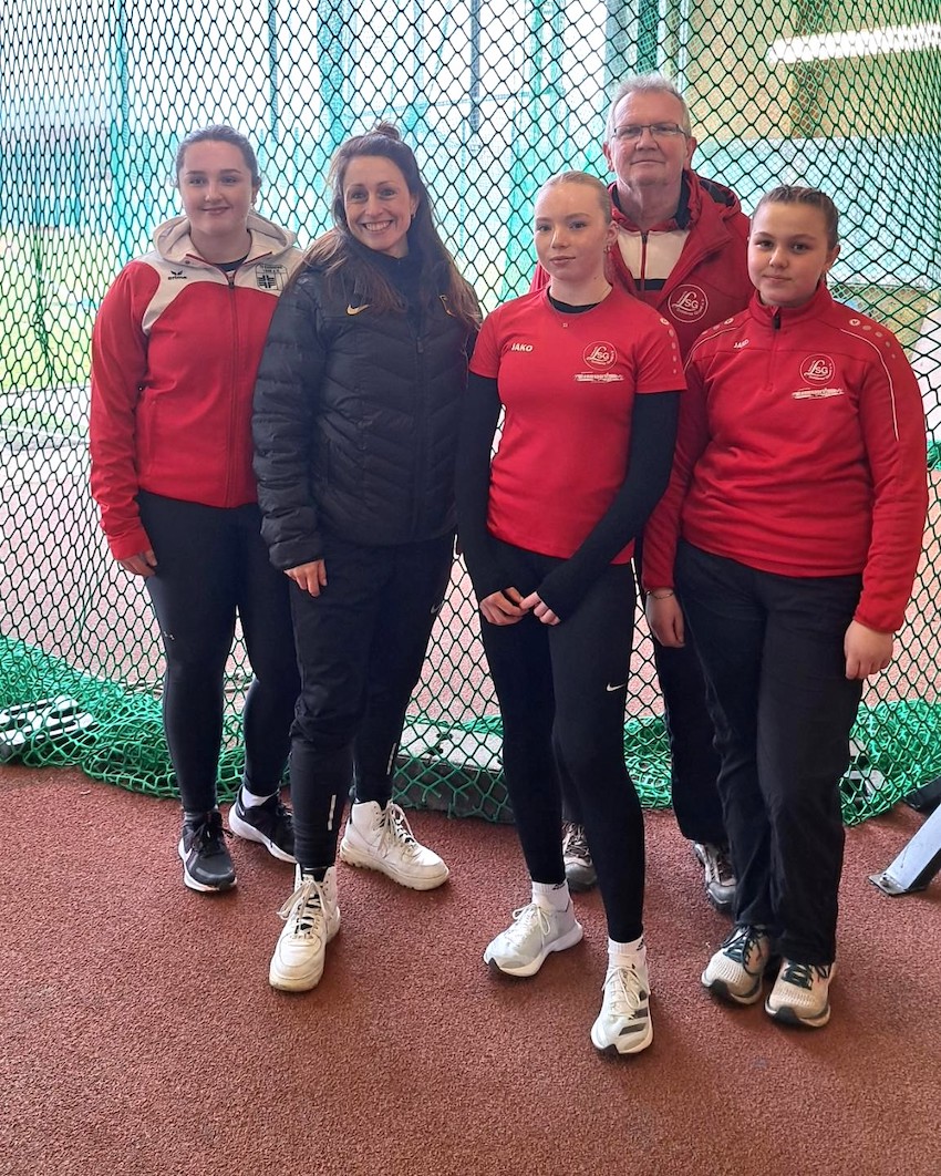 Polly Nierfeld knackte im Hammerwurf der W15 gleich im ersten Wettkampf der Saison die 40 m-Marke. Im letzten Jahr war dies die Qualifikationsweite für die Deutschen Meisterschaften gewesen – für dieses Jahr stehen die Normen noch nicht fest. Polly warf in Niederrad eine stabile Serie. Ihr weitester Wurf mit dem 3 kg-Gerät landete bei ausgezeichneten 40,24 m. Damit wurde sie vor den Augen ihrer Kadertrainerin Kathrin Klaas (4. der olympischen Spiele 2012), bei der sie das Techniktraining absolviert, Hessische Winterwurfmeisterin.