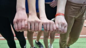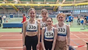 Die Erfolgsstory von Leslie Arbeiter ging, nach den schönen Erfolgen bei den Hessenmeisterschaften, bei den Regional-Hallenmeisterschaften in Hanau weiter. Im Weitsprung der W 15 hatte sie eine gute Serie, belegte mit 4,30 m den 6. Platz und verfehlte ihre Freiluftbestleistung nur um 4 cm. Durch das hohe Meldeergebnis und einigen Verzögerungen im Zeitplan, musste Leslie dann sofort zum Kugelstoßen hetzen, was bereits begonnen hatte und ohne sich Einstoßen zu können, mit dem Wettkampf beginnen, wodurch sie etwas unter ihren Möglichkeiten blieb, aber dennoch mit guten 9,52 m den 2. Platz und die Vizemeisterschaft errang. Leider wurde dabei auch die Nervosität für die direkt folgende 4 x 100 m Staffel immer größer, wo das LfV-Quartett mit Leslie, Xenia Horst, Staecy Fleig und Junia Schröder ihr Debüt gab und mit guten Wechseln und der Zeit von 61,24 sek auf den 5. Platz landete.