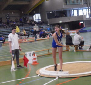 Die Erfolgsstory von Leslie Arbeiter ging, nach den schönen Erfolgen bei den Hessenmeisterschaften, bei den Regional-Hallenmeisterschaften in Hanau weiter. Im Weitsprung der W 15 hatte sie eine gute Serie, belegte mit 4,30 m den 6. Platz und verfehlte ihre Freiluftbestleistung nur um 4 cm. Durch das hohe Meldeergebnis und einigen Verzögerungen im Zeitplan, musste Leslie dann sofort zum Kugelstoßen hetzen, was bereits begonnen hatte und ohne sich Einstoßen zu können, mit dem Wettkampf beginnen, wodurch sie etwas unter ihren Möglichkeiten blieb, aber dennoch mit guten 9,52 m den 2. Platz und die Vizemeisterschaft errang. Leider wurde dabei auch die Nervosität für die direkt folgende 4 x 100 m Staffel immer größer, wo das LfV-Quartett mit Leslie, Xenia Horst, Staecy Fleig und Junia Schröder ihr Debüt gab und mit guten Wechseln und der Zeit von 61,24 sek auf den 5. Platz landete.
