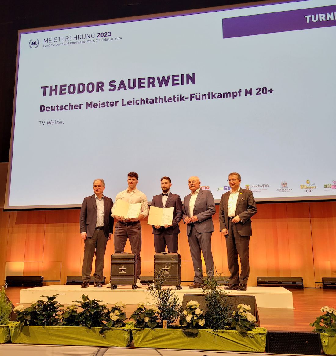 141 der Sportasse nahmen persönlich ihre Meisternadeln, Urkunden und Präsente aus den Händen von Wolfgang Bärnwick (Präsident des Landessportbundes Rheinland-Pfalz) entgegen. Unter ihnen auch Theodor Sauerwein, der für seinen Titel „Deutscher Meister im Leichtathletik-Fünfkampf der Männer 20+“ geehrt wurde. Diesen für ihn schon insgesamt 15. Meistertitel im Trikot des TV Weisel gewann er am 24. September 2023 bei den Deutschen Meisterschaften des Deutschen Turnerbundes in Dieburg, als er seinen großen Erfolg aus 2022 wiederholen konnte.