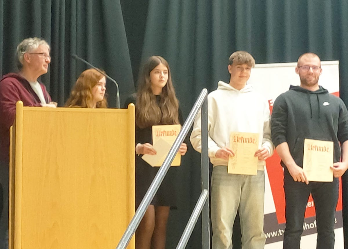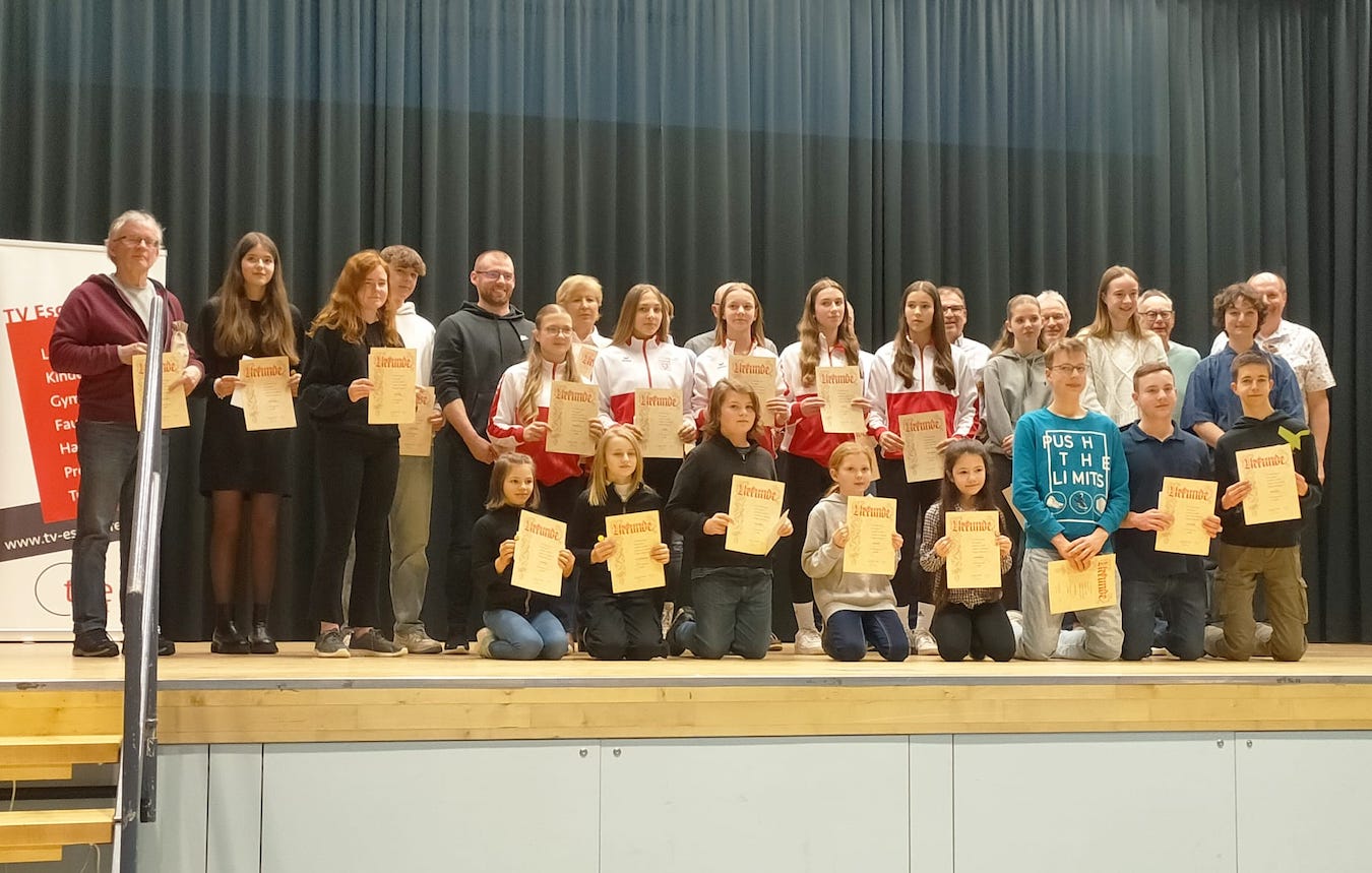 Die silberne Ehrennadel erhielten Martin Frömel – Hessenmeister im Schleuderball und im Steinstoßen M 60, Staecy Fleig – Hessenmeisterin im Schleuderball WJ 12-13, Lio Bauer – Hessenmeister im Steinstoßen MJ 14, Leon Gehrmann – Hessenmeister im Steinstoßen MJ 15 und Dr. Clemens Tilke – Hessenmeister im Steinstoßen M 50. Die Ehrennadel in Gold erhielten Lorenz Braun – 2. Platz bei den Deutschen Meisterschaften im Schleuderball und im Steinstoßen der Männer, Hessenmeister im Schleuderball und im Steinstoßen der Männer, Jannik Schmidt – 2. Platz bei den Deutschen Meisterschaften im Steinstoßen MJ 16-17, Hessenmeister im Fünfkampf, im Schleuderball und im Steinstoßen MJ 16-17 und Leslie Arbeiter – 3. Platz bei den Deutschen Meisterschaften im Schleuderball WJ 14-15, Hessenmeisterin im Fünfkampf, im Schleuderball WJ 14-15 und im Steinstoßen WJ 15. Außerdem erhielten alle noch eine Urkunde und ein kleines Präsent für ihre erbrachten Leistungen. LfV-Vorsitzender und Gau-Ehrenmitglied Walter Haas, gab einen nicht allzu positiven Jahresrückblick von den leichtathletischen Mehrkämpfen im Turngau und im Turnverband.