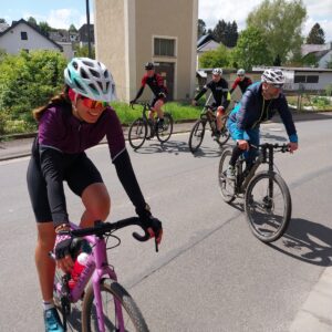 Durch die Stadt ging es weiter nach Diez auf den Aartal-Radweg, wo man nach kurzer Dauer in Niederneisen links hoch in Richtung Mensfelden fuhr. Oben angekommen wartete Bernd Falkenbach am Mensfelder Kopf mit Kalt- und Heißgetränken, Bananen und Snacks. Nach kurzem Stopp ging es in rasender Fahrt hinunter durch Nauheim nach Werschau um dann links über den Radweg nach Dauborn zum mittlerweile traditionellen Abschluss bei Christa und Arno Wagner. Frischer Kuchen von Christa, selbstgemachter Eierlikör und eine Probe edler Dauborner Brände wurden verköstigt.