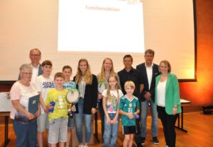 Der Familienwettbewerb, den es seitens des Landessportbundes Hessen seit vielen Jahren gibt, der mit einer Urkunde belohnt und seit Neustem durch ein Geschenk des Sportkreises Limburg-Weilburg ergänzt wird, ist sehr beliebt und in den vergangenen beiden Jahren haben jeweils über 60 Familien teilgenommen. Stellvertretend für alle Familien wurden für jedes Jahr eine Familie ausgewählt und eingeladen. So durften die Familie Müller vom TV Nauheim, bestehend aus Oma Christel, Sohn Jörg und den Enkelkindern Raphael, Leo und Samuel und die Familie Simon vom RSV Weyer, bestehend aus den Eltern Falk und Tanja sowie den Kindern Amelie, Nora und Henri ihre Urkunde und ihr Badmintonset auf der Bühne entgegennehmen.
