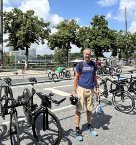 Das Schwimmen war für Peter etwas zäh, allerdings absolviert Peter auch seit 2019 keinerlei Schwimmtraining mehr und so war er mit den 84 Minuten zufrieden und auch nur 2 Minuten langsamer als vor einem Jahr in Roth. Hinzu kommen die Zeiten in der Wechselzone und da Hamburg die längste Wechselzone der Welt hat waren es insgesamt 15 Minuten.