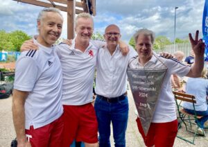 Im heftigen Münchner Dauerregen traf die Hessenauswahl am ersten Turniertag auf der Anlage von Wacker München zunächst auf das Team aus Baden-Württemberg mit dem früheren Bundesliga- Torschützenkönig Matthias Bleyle und dem langjährigem Bundesliga-Innenverteidiger Christoph Wüterich, beide von den Stuttgarter Kickers. Das Spiel endete hochverdient 1:0 für Hessen, das kompakt agierte und in allen Belangen überlegen war. Im zweiten Spiel hatte die Hessenauswahl es mit dem sehr spielstarken Hamburger Team zu tun. Hamburg dominierte die 1. Halbzeit mit schnellen und präzise vorgetragenen Spielzügen. Durch einen Siebenmeter des schon seit vielen Jahren in Hamburg lebenden und aus Elz stammenden Hockey-Olympiasiegers Stefan Saliger ging Hamburg recht früh in Führung. Einen weiteren Siebenmeter konnte der hessische Torwart aus Frankfurt erfolgreich parieren. In der 2. Halbzeit spielte Hessen deutlich couragierter auf und zwang die Hanseaten immer mehr in deren eigene Hälfte. Christopher Zilliken und Hermann Hartvelt trieben über die Außenverteidigerposition und das Mittelfeld dabei kontinuierlich Angriffe in den gegnerischen Schusskreis. Die überlegene hessische Fitness schien sich doch noch auszuzahlen, doch Hamburg hielt stand und gewann glücklich mit 1:0 – gleichbedeutend mit dem einzigen Turnier-Gegentor der Hessen.