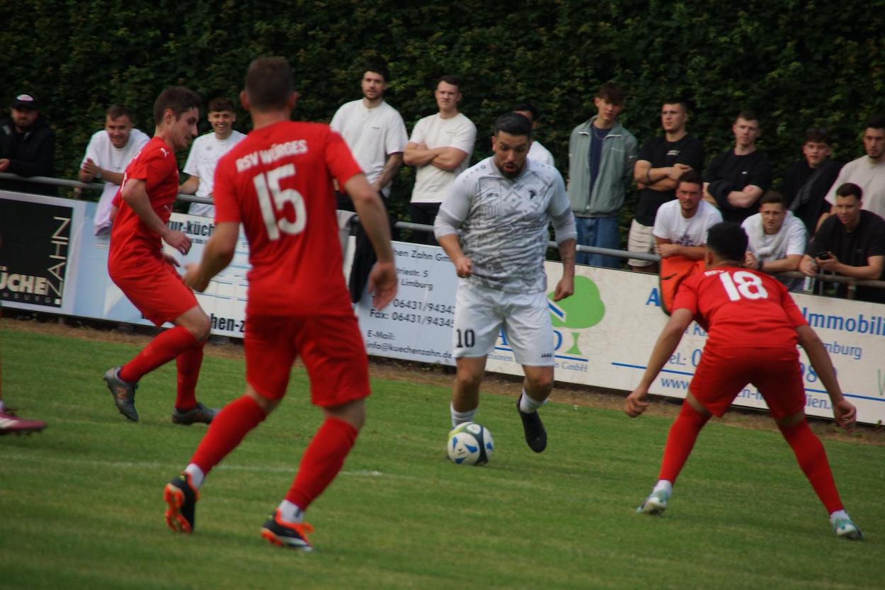 RSV Würges – SV 1921 Erbenheim 1:3 (0:2). – Zwar Würges gleich zu Beginn mit den ersten Aktionen und einem Flankenball in den Strafraum, der aber ohne Abnehmer blieb. Beim ersten Erbenheimer Vorstoß nahm das Unheil aber gleich seien Lauf: Foulelfmeter verursacht an Kouami Edem Dalmeida, Strafstoß durch Fouad El Bakkaoui sicher verwandelt zur Gästeführung (4.). Der Gast konnte sich darauf nun gut ausruhen und dem RSV eine meist nutzlose optische Überlegenheit mit mehr Ballbesitzphasen gewähren. Nico Brands schickte dann aber mit tollem langen Pass über 40 Meter Jermaine Pedraza auf die Reise, der den Abschluss aber völlig verzog (16.). Erbenheim dann in Person von Karim El Bakkaoui knapp links oben am Würgeser Kasten vorbei aus 25 Metern (20.). Wieder Jermaine Pedraza für Würges dann aktiv: starke Einzelleistung gegen gleich drei Gästespieler – Abschluss in etwas Rücklage über das Tor (28.). Der Gast mit einem Kopfall durch Bilal Oukouiss, rechts oben über das Gehäuse gesetzt (34.). Das zweite Erbenheimer Tor dann wirklich unnötig: Schlecht verteidigt auf Würges‘ linker Seite, Nikals Feidt setzte sich durch, schloss aus schon spitzem Winkel satt ab ins lange Eck und Keeper Leon Kröller noch durch die Beine, aber der Fehler passiert zuvor bereits – 0:2 (37.). Dann nochmal ähnlich wieder ein Angriff auf Erbenheims rechter Seite, Leon Kröller greade noch vor dem Abschluss von Kouami Edem Dalmeida zur Stelle (40). So ging es in die Pause.