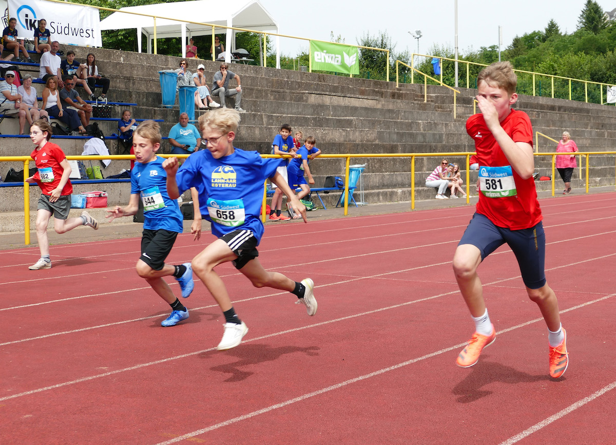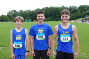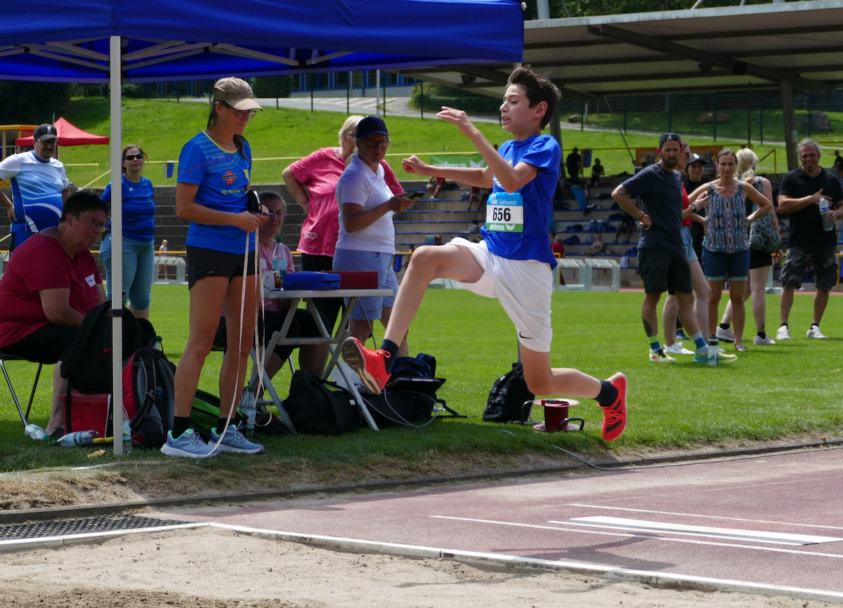 Am 2. Tag blieb der angekündigte langanhaltende starke Regen glücklicherweise im Vierkampf der U16 aus. Dennoch waren die Leistungen im Hochsprung morgens als erster Disziplin der M14 durch den nächtlichen Regen mit dem nassen Absprungbereich vor der Latte beeinflusst, obwohl die Helfer der ausrichtenden TG Konz alles Mögliche unternommen hatten, gute Bedingungen zu schaffen. Somit übersprang Aart Brünner zusammen mit einem weiteren Athleten 1,52 m als höchster Höhe unter den 13 Startern. Zusammen mit 12,12 s über 100 m, mit 5,55 m im Weitsprung und 12,10 m im Kugelstoßen gewann er alle Disziplinen, so dass er sich letztlich mit 2172 P und mehr als 200 P  Vorsprung vor dem Zweitplatzierten über den Rheinlandmeis-tertitel im Vierkampf freuen konnte. Einen guten Vierkampf bestritt auch Rafael Geschwind (beide M14), der mit 1,44 m im Hochsprung  sowie 4,42 m im Weitsprung persönliche Bestleis-tungen erzielte und den Vierkampf mit 1536 P beendete. Bei Connor Roth (M15) wechselten Licht und Schatten. Mit 2 persönlichen Bestleistungen über 100 m in 13,23 s und mit seinem ersten 5 m Sprung auf 5,08 m im Weitsprung umrahmte er den Vierkampf. Im Hochsprung musste er den Wettkampf mit übersprungenen 1,44 m gesundheitlich gehandicapt abbrechen, während die 4 kg-Kugel nach einem guten Einstoß am Schluss nur auf 9,93 m landete. Somit be-legte er mit 1892 P – nur um ärgerliche 2 Punkte geschlagen – Platz 4. In der Mannschaftswertung freuten sich Connor, Aart und Rafael mit 5600 P jedoch über einen tollen Platz 2.