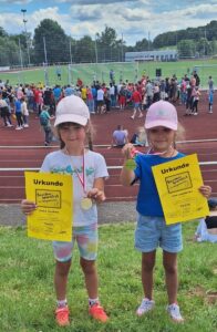 Auch in den älteren Altersklassen gab es tolle Platzierungen. Laura Fiedler schaffte in der W 10 mit 859 P. (8,96 sek/2,95 m/19,00 m) den Sprung aufs „Treppchen“ und wurde 3. Auf Platz 11 kam in dieser Klasse Sophie Grieswald mit 667 P. (9,78 sek/2,55 m/14,50 m). 6. wurde in der W 11 Emilia Dvortsova mit 889 P. (9,69 sek/3,27 m/23,00 m). In der Klasse M 10 belegte Niklas Grieswald mit 656 P. (9,00 sek/2,71 m/23,00 m) den 9. Platz, Fabio Heinbuch wurde mit 618 P. (9,78 sek/2,53 m/28,00 m) 11. und Luke Schmidt mit 613 P. (9,59 sek/2,71 m/23,00 m) 12. Alle Kinder erhielten als Belohnung für ihre tollen Leistungen eine Medaille und hatten große Freude und viel Spaß beim großartigen Bambini-Sportfest in Mengerskirchen.