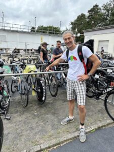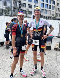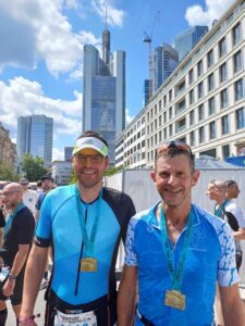 Mit Mike Enders Peter Ringeisen, Tobias Roos und Jan Wozniak stellte die VLG Eisenbach vier der insgesamt 2.500 Teilnehmer beim City Triathlon in Frankfurt. Bereits um 06.30 fiel am Langener Waldsee der Startschuss zur Mitteldistanz mit 2 Kilometer Schwimmen ohne Neopren-Anzug. Ab der Wechselzone ging es mit dem Rad 80 Kilometer zunächst nach Frankfurt und dann in 4 Radrunden durch die Frankfurter City. Beim abschließenden Lauf über 20 Kilometer waren es auch noch einmal 4 Runden auf einem recht eckigen Rundkurs durch die Frankfurter Innenstadt. Für das Eisenbacher Trio lief es bei optimalen Wetterbedingungen sehr gut. Allen voran ist der VLG-Triathlon- Sportwart Jan Wozniak zu nennen, der mit seiner hervorragenden Schwimmzeit von 40:43, der Radzeit von 2:05:30 und der Laufzeit von 1:30:23 die Gesamtzeit von 4:23:06 Stunden und Rang 17 in der Altersklasse M 35 erreichte. Für Peter Ringeisen gab es mit der Gesamtzeit von 4:34:36 Stunden sogar Rang 9 in der M 45 und Tobias Roos belegte in der M 40 Platz 49 mit der Zeit von 5:01:59 Minuten. Anja Wied aus Mengerskirchen kam in der W 45 auf Rang 9 in 5:38:12 Stunden, Luca Kremer aus Brechen mit der Zeit von 5:42:48 auf Rang 16 in der M 20. Till Eckert von der TSG Oberbrechen war direkt dahinter auf Rang 17 mit der Zeit von 5:44:44 Stunden.