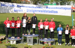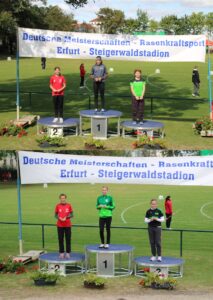 Gespannt erwarteten alle die Siegerehrung in der Mannschaftswertung. Neun Teams kamen in die Wertung. Der Jubel war riesig, als Hanna, Marie und Pauline als 2. und damit als Deutsche Vizemeisterinnen aufgerufen wurden und einen Pokal entgegennehmen durften. Amelie freute sich natürlich mit ihnen und ihr Trainer Jürgen Willert war sichtlich stolz auf seine Schützlinge: „Ich bin absolut begeistert vom Wettkampf der vier Mädels. Rasenkraftsport macht Spaß!“ Eine Fortsetzung im nächsten Jahr folgt bestimmt. Alle waren sehr erfreut, zum ersten Mal DM-Luft geschnuppert zu haben…