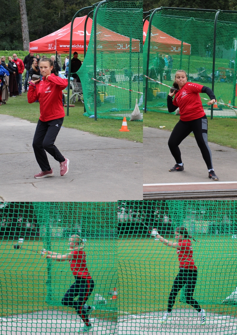 Pauline durfte im Leichtgewicht antreten. Besonders gut lief es für sie im Gewichtwerfen und im Steinstoßen. Sie schleuderte das 3 kg-Gewicht auf erfreuliche 16,82 m und blieb damit nur leicht unter ihrer Bestweite. Im 3 kg-Steinstoßen steigerte sie ihre Bestweite um 70 cm auf 7,63 m. Nur mit dem 3 kg-Hammerwerfen auf 23,22 m war sie nicht ganz zufrieden. Dennoch schaffte sie 1669 Punkte im Dreikampf, die nah an ihrer Bestleistung lagen. Die Siegerehrung brachte dann die große Überraschung: Pauline wurde im Gewichtwerfen Deutsche Schülervizemeisterin und holte sich Bronze im Dreikampf. Im Hammerwurf und Steinstoßen wurde sie jeweils Vierte.