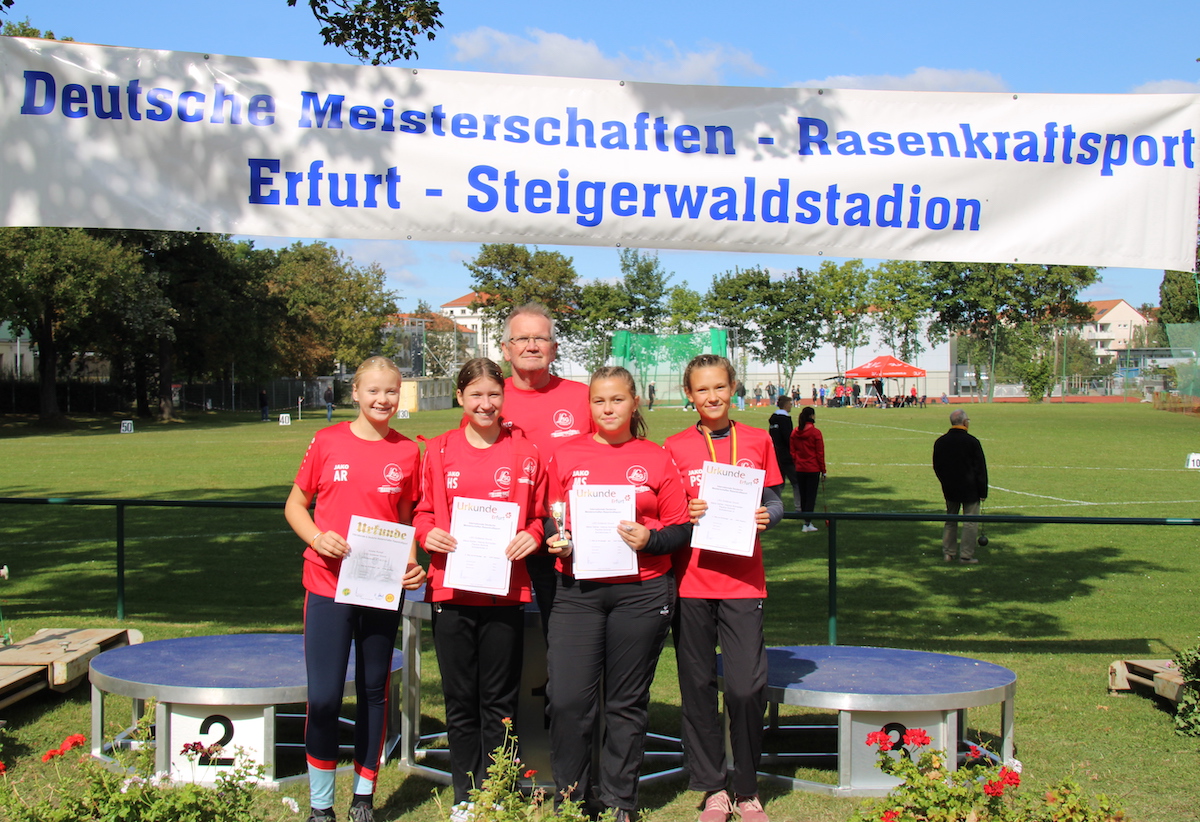 Gespannt erwarteten alle die Siegerehrung in der Mannschaftswertung. Neun Teams kamen in die Wertung. Der Jubel war riesig, als Hanna, Marie und Pauline als 2. und damit als Deutsche Vizemeisterinnen aufgerufen wurden und einen Pokal entgegennehmen durften. Amelie freute sich natürlich mit ihnen und ihr Trainer Jürgen Willert war sichtlich stolz auf seine Schützlinge: „Ich bin absolut begeistert vom Wettkampf der vier Mädels. Rasenkraftsport macht Spaß!“ Eine Fortsetzung im nächsten Jahr folgt bestimmt. Alle waren sehr erfreut, zum ersten Mal DM-Luft geschnuppert zu haben…