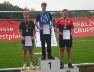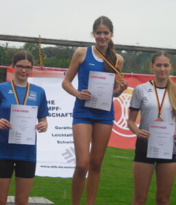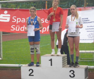 Dann begann die Goldene Zeit von Jannik Schmidt und Leslie Arbeiter. Jannik wuchtete im Steinstoßen der MJ 16-17 den Stein auf großartige 8,40 m (PB) und holte sich überlegen den Deutschen Meistertitel und die Goldmedaille. Im Schleuderball belegte er mit 51,46 m den 4. Platz. Einen goldenen Abschluss gab es dann noch im letzten Wettbewerb der Meisterschaft, dem Schleuderball der WJ 14-15. Hier sorgte Leslie Arbeiter gleich im 1. Versuch für klare Verhältnisse mit 40,11 m. Mit dieser Weite konnte sie ihre Bronzemedaille aus dem Vorjahr vergolden und gewann souverän ihren ersten Deutschen Meistertitel.
