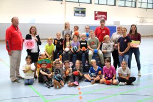 Im Rahmen der ersten AG-Stunde des neuen Schuljahrs überreichte Martin Rumpf, Vizepräsident Sportentwicklung des HLV, sowohl das Gütesiegel des HLV als auch ein attraktives Materialpaket im Wert von 500 Euro an die Verantwortlichen der Schule im Goldenen Grund. Es umfasste u. a. ein großes Set Schaumstoffblöcke, Staffelstäbe, Schweifbälle, Medizinbälle, eine flexible Hochsprunglatte sowie Literatur/Handreichungen zur Leichtathletik in der Schule, zum „Jugend trainiert für Olympia“ Grundschulwettbewerb und Übungskarten für die Bundesjugendspiele.