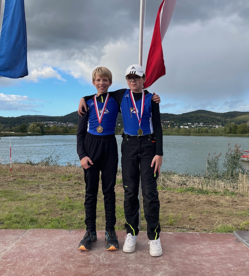 Auch sein jüngerer Bruder Jonas Schicker sicherte sich, gemeinsam mit Till Bontjer, im Doppelzweier der 11&12-jährigen Jungen in einem starken Rennen die Goldmedaille.