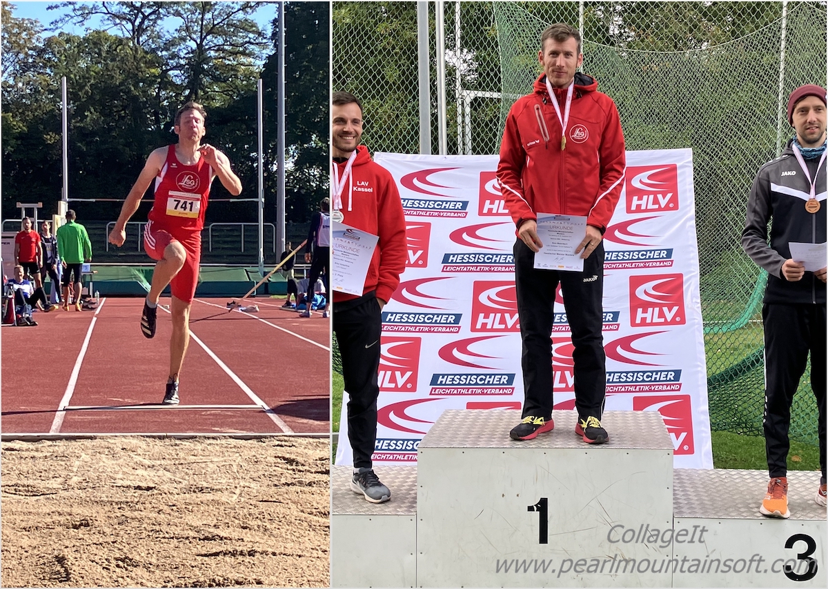 Es folgte der Weitsprung und hier spielte er einmal mehr seine Stärke aus. Mit beachtlichen 6,27 m flog er so weit wie kein anderer Athlet der M30 und holte sich mit großem Vorsprung den Hessenmeistertitel. Noch vor seinem 6. und letzten Versuch ging er über 200 m an den Start und sprintete nach erfreulichen 23,97 s als Vizemeister über die Ziellinie.