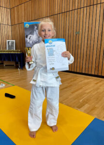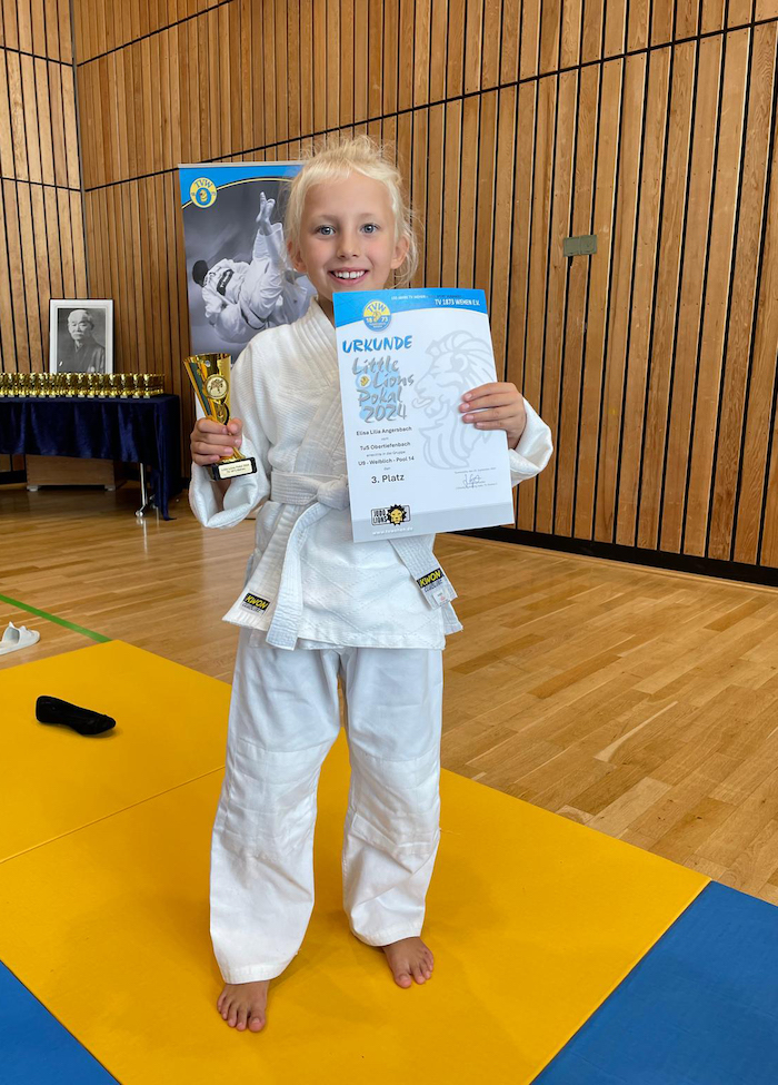 Die Judo Abteilung des TV Wehen veranstaltete am Sonntag, den 29.09.2024 den „Little Lions Pokal 2024“ zu dem wir herzlich eingeladen wurden. Er soll hauptsächlich den Judo-Anfängern den Start in das Wettkampfgeschehen näherbringen. Die gewünschte Zielgruppe waren die Anfänger mit der Gürtelfarbe „weiß“ (nur mit Erlaubnis der Heimtrainer) also Judoka ohne bisherige Wettkampferfahrung. Leider hat von unseren Weiß-Gurten nur ein Judoka daran teilgenommen. Unser Judoka Elisa Angersbach nahm mutig die Gelegenheit wahr und startete in der Gruppe U9 w. Obwohl sie noch keinen Wettkampf besucht hatte, konnte sie sich gegen ihre Gegner sehr gut behaupten. Sie erreichte den 3.Platz im Pool 11 im Kampf Mann gegen Mann. Stolz zeigt sie uns ihren erarbeiteten Pokal und ihre Urkunde. Wenn Elisa sich weiterhin so gut anstrengt, werden wir noch Einiges von ihr hören.