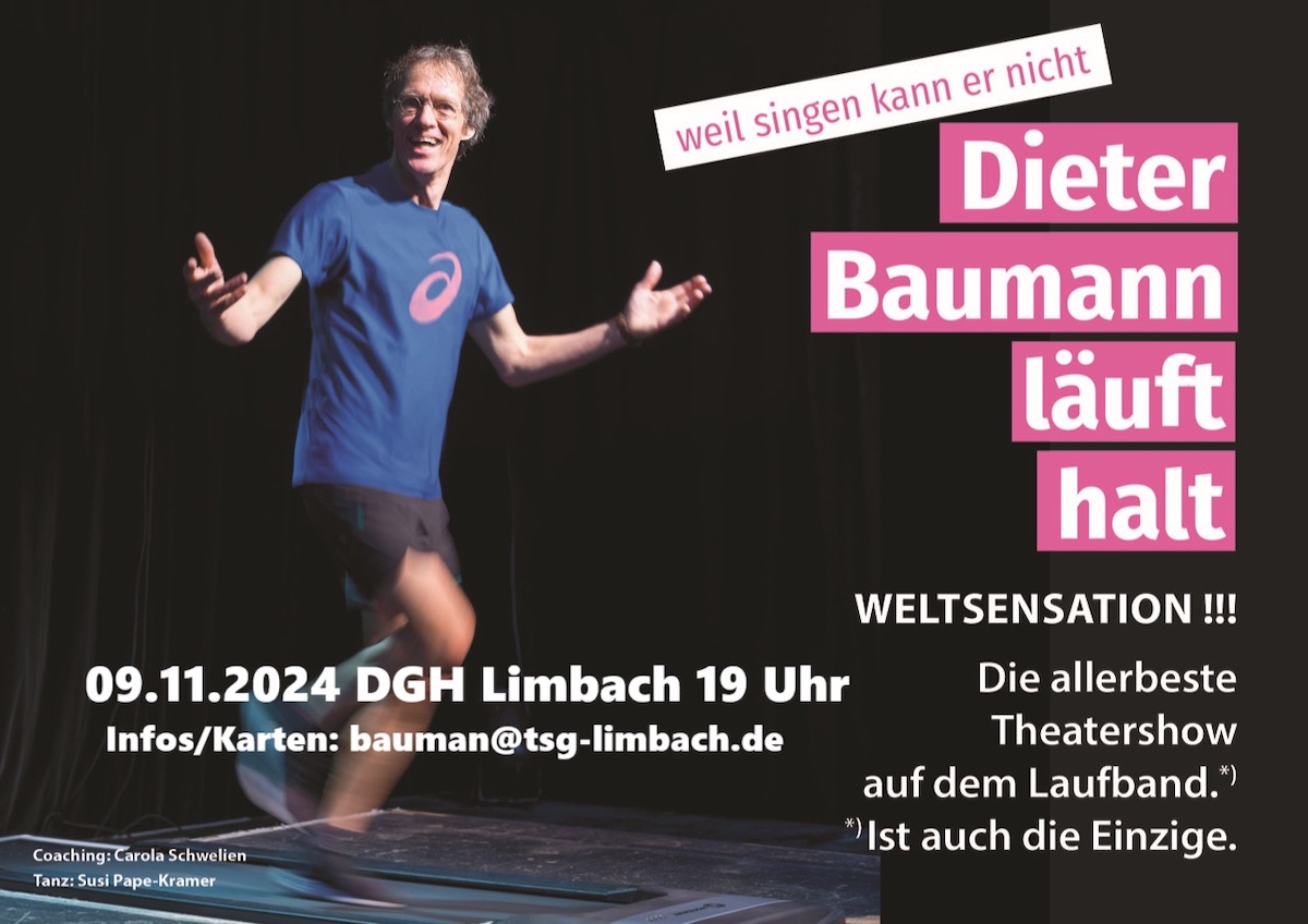 Erleben Sie Dieter Baumann am 9.11. in Limbach: Selbstironisch, witzig, gestenreich, und ja, er tanzt sogar. An Stellen, an denen es scheinbar nichts zu tanzen gibt. Aber, vor allem: Baumann – läuft!