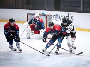 Verteidiger Mike Klingsporn, der den Gegner abdrรคngt und links mรถchte Stรผrmer David Lademann unterstรผtzen und sich den Puck schnappen.- Foto: Tristen Hoffmeister