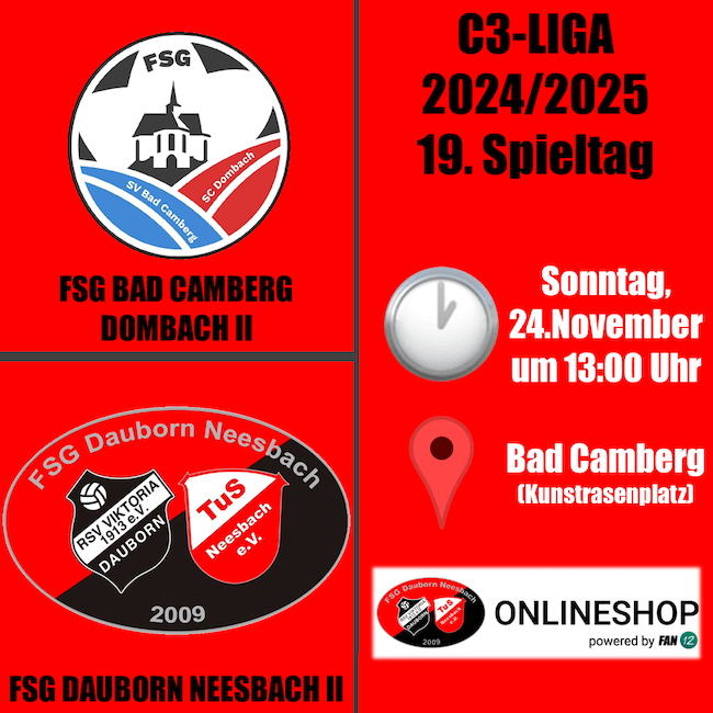 Auch die Schmitt/Busche Elf reist in die Kurstadt und trifft auf den Tabellennachbarn von Platz 10, die FSG Bad Camberg/Dombach II, der nur um 3 Punkte schlechter als der Gegner dasteht. Im Falle eines Sieges, könnte man an den Gästen vorbei ziehen, da man auch schon das Hinspiel zu Saisonbeginn knapp mit 3:2 für sich entscheiden konnte. Anstoß dieser Partie ist um 13 Uhr.