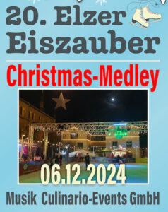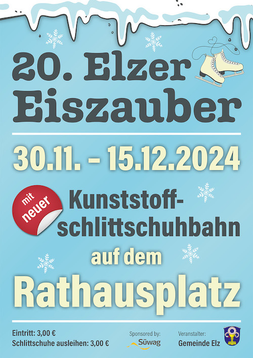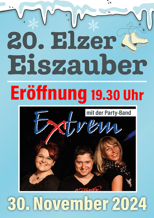 Das Elzer Wintermärchen findet in diesem Jahr zum 20. Mal statt. Vom 30. November bis zum 15. Dezember öffnet die 265 m² große Schlittschuhbahn auf dem Rathausplatz. An dem ersten Eiszaubertag bereits am Nachmittag, ab 13.00 Uhr, ist sie geöffnet, offiziell dann um 19.30 Uhr durch Bürgermeister Matthias Schmidt und einem stimmungsvollen Rahmenprogramm. Die Live-Band „Extrem“ wird an diesem Abend für die musikalische Unterhaltung der Eisbahngäste sorgen.