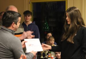 Am Ende der kurzen Bilanz bedankte sich der 1. Vorsitzende bei allen Helfern, Spendern und Sponsoren und allen, die in irgendeiner Weise zum Wohle des Vereins tätig waren und den Verein unterstützt haben und wünschte allen ein frohes und friedliches Weihnachtsfest, sowie alles Gute, vor allem Gesundheit, für 2025. LfV – Sportlerin des Jahres 2024 wurde Leslie Arbeiter (Kreismeisterin 100 m, Weit, Hoch, Kugel, Diskus,4-Kampf und 4-Kampf-Mannschaft, Hessenmeisterin 5-Kampf, Schleuderball und Steinstoßen und Deutsche Meisterin im Schleuderball), vor Jannik Schmidt (Hessenmeister Schleuderball und Steinstoßen, Deutscher Meister im Steinstoßen) und Alia Steinmetz (Kreismeisterin mit der 4 x 100 m Staffel, Hessenmeisterin im Schleuderball und Deutsche Vizemeisterin im Schleuderball).
