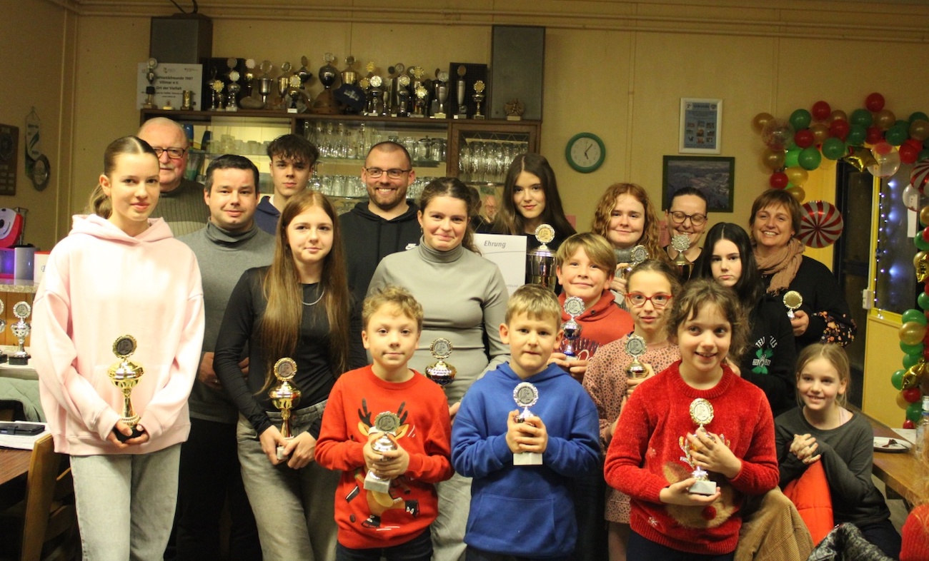 Lorenz Braun, Nele Herborn, Junia Schröder, Staecy Fleig, Xenia Horst, Lara Ahl, Laura Fiedler, Emilia Dvortsova, Nina Erdmann, Armin Conrad, Niklas Grieswald, Sophie Grieswald, Nic Binnentreu, Nadine Kissel, Lennard Schmidt, Clemens Tilke und Martin Frömel. Eine ganz besondere Ehrung wurde dann den beiden Deutschen Meistern noch zuteil. Sportkreis-Vorstandsmitglied Andreas Hofmeister, verlieh im Namen des Landes-Sportbundes Hessen Leslie Arbeiter und Jannik Schmidt die silberne Leistungsnadel für besondere sportliche Leistungen. Der Pokal als Leichtathletikfreund des Jahres 2024 ging an Katrin Horst, die außerdem, wie alle anderen fleißigen Helfer, mit einem Präsent bedacht wurde. Dieser Pokal wurde bereits zur ersten Weihnachtsfeier 1987 gestiftet und kann von jedem Mitglied nur einmal errungen werden, für besondere Verdienste im Verein. Während sich im gemütlichen Vereinsheim die Erwachsenen Kaffee, Kuchen und diverse Getränke schmecken ließen und sich angeregt unterhielten, spielten die Kinder voller Begeisterung draußen. Gegen Ende, wurde es dann noch einmal richtig weihnachtlich. Bei leiser Berieselung von weihnachtlichen Klängen, erschien der Nikolaus und verteilte an alle eine kleine Gabe. So ging dann mit guten Wünschen zu Weihnachten und für das neue Jahr eine schöne und harmonische Weihnachtsfeier zu Ende und alle waren zufrieden und freuen sich auf das kommende Jahr 2025. Die LfV-Winterwanderung ist für den 11. Januar 2025 geplant.