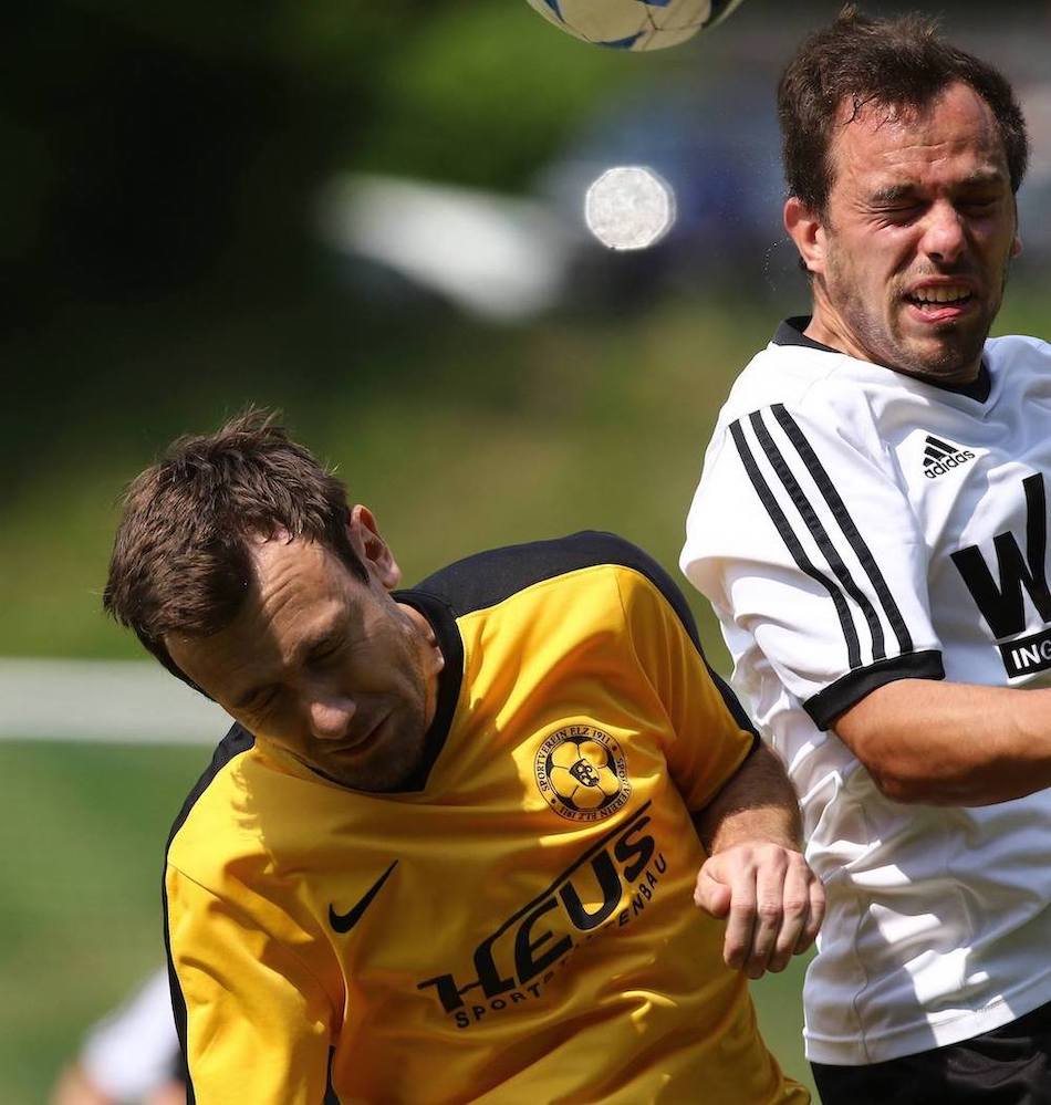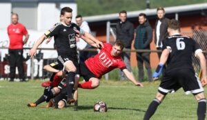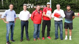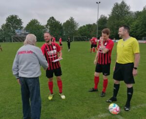 Franz-Josef Blatt von sport 11 zeichnet Hendrik Wern-Schäfer – für sein 100. Tor für die SG Heringen/Mensfelden -aus. Auf dem Foto noch zu sehen – der damalige Spielertrainer Sascha Merfels. Foto: Hans-Günter Pulch
