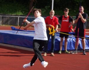 Christian Kessler (LC Mengerskirchen) sprang sich mit seinem Sieg im Hochsprung der Schüler M14 in den Fokus. Er meisterte die Höhe von 1,70 Meter und katapultierte sich in der Deutschen Bestenliste seiner Altersklasse auf Platz Fünf. Aus der Sicht des Gastgebers sorgte der Speerwerfer Lennart Bessems (Männliche Jugend U20) für ein Frohlocken im Gesicht seiner Trainer Wioletta Luczak-Tasch. Bessems schleuderte trotz des Abiturstresses das Gerät 49,86 Meter weit und „kratzte“ an der 50 Meter-Marke. Bessems wird es zu Beginn des neuen Hochschulsemesters zur Weiterbildung nach Frankfurt verschlagen. „Mit der Leistung von Lennart bin ich mehr als zufrieden. Im Übrigen war dieses Sportfest eine gute Gelegenheit für unsere Werfergruppe sich zu präsentieren“, konstatierte die TG-Übungsleiterin. Sebastian Arnold (TuS Weilmünster) nutzte die Stippvisite in Bad Camberg zur Überprüfung seiner Form im Speerwerfen und im Hochsprung für seine Ambitionen im Zehnkampf.