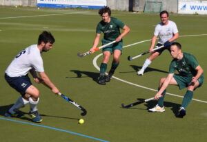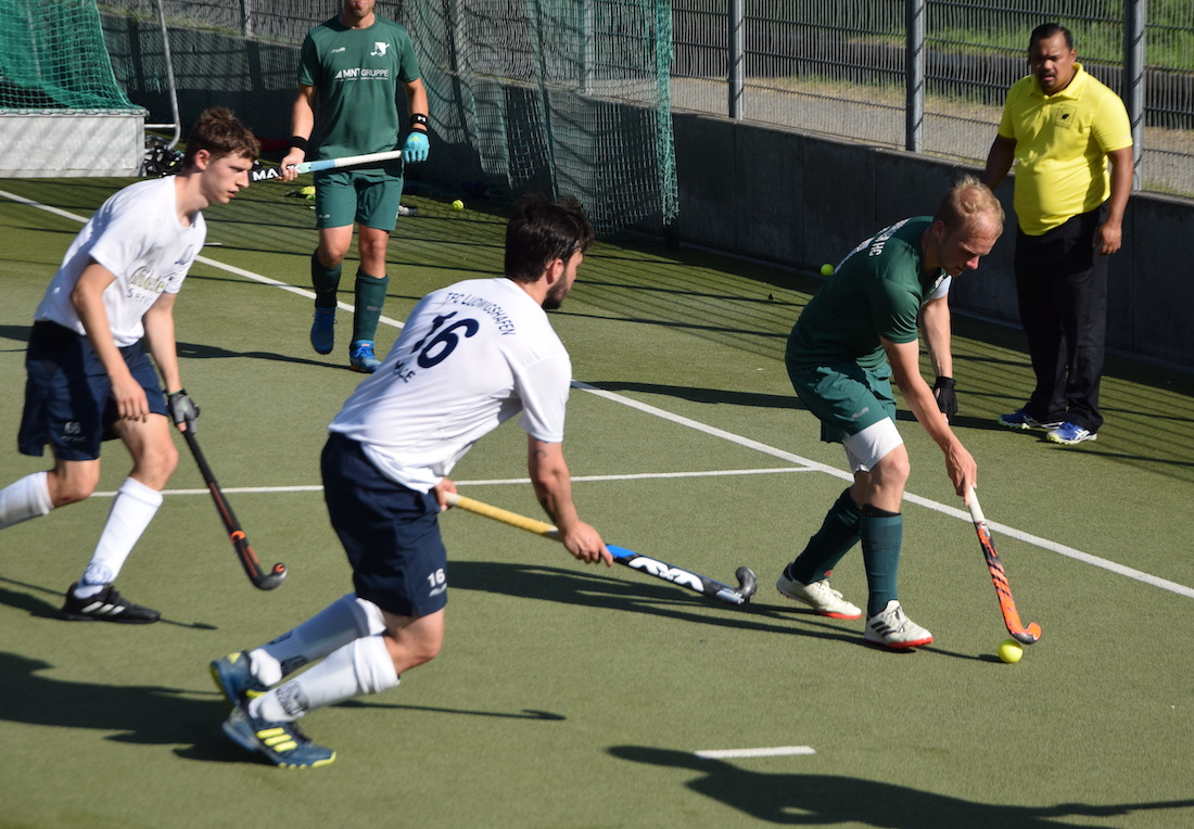 Jelle Mourik (Mitte) und Lars Schmitt (rechts) in den grünen Trikots hielten mit dem LHC durch taktische Disziplin das 2:2 gegen Ludwigshafen.
