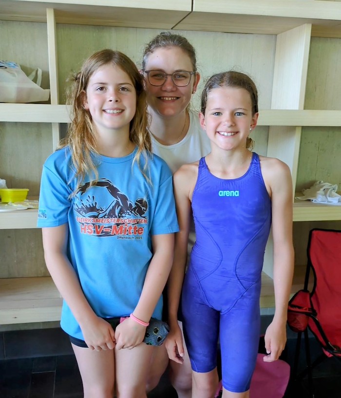 Trainerin Anja Mareike Hamm (mitte) freut sich mit den Jungschwimmerinnen Klara Häbel (links) und Rosalie Hemmerich (rechts) über ihre erstmalige Qualifikation für die Hessenmeisterschaften.
