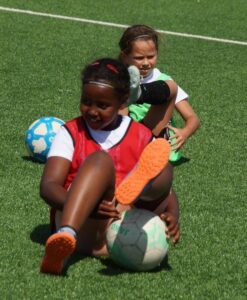 Nach neunzig schweißtreibenden Minuten verdienten sie sich dann auch einen Pause und stärkten sich für das darauf folgende Sportabzeichen. Hier waren alle mit vollem Elan dabei und die Siegerinnen, die Mädchen wurden in vier Gruppen aufgeteilt, freuten sich über signierte Trikots von Eintracht Frankfurt und der Deutschen Fußball Nationalmannschaft. Zum Schluss überreichte Organisator Oliver Roos allen teilnehmenden Mädchen jeweils eine Teilnehmerurkunde, eine Urkunde fürs Sportabzeichen sowie Armbänder und Stecknadeln des Deutschen Fußballbundes.