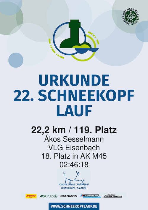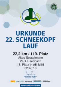 Wenn man wie Àkos Sesselmann von der VLG Eisenbach in Neuhaus am Rennsteig geboren wurde und der Veranstalter des Rennsteiglaufes zum 22. Schneekopflauf mit der Bezeichnung „ Rennsteiglauf- hoch-3 „ einlädt, dann ist Àkos mit seiner Frau Antje unterwegs in die thüringische Heimat. Antje startete auf der 12,7 Kilometer langen Strecke mit 417 Höhenmetern und Àkos auf der 22,2 Kilometer Strecke und 803 Höhenmetern bei einem der schönsten Bergläufe, die nichts für ungeübte „Flachlandtiroler „ ist.