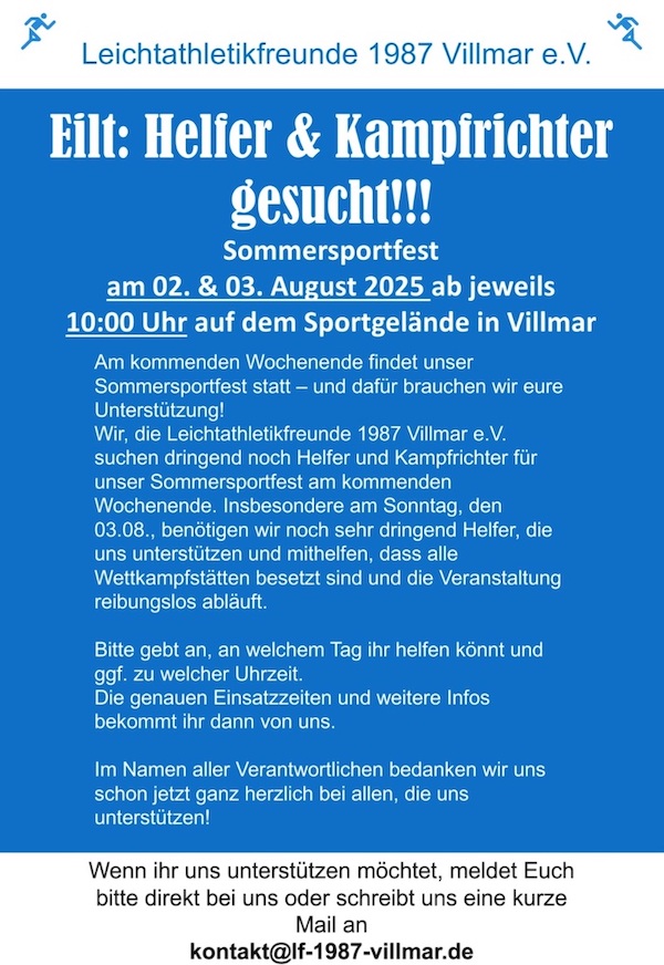Die Leichathletikfreunde 1987 Villmar e.V. suchen für den 2. + 3. August (jeweils ab 10.00 Uhr) Helfer und Kampfrichter. Nähere Informationen könnt ihr dem blauen Flyer entnehmen. (einfach anklicken)
