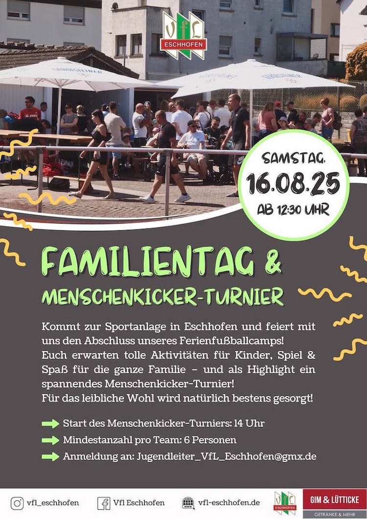 Im Anschluß an das Fussball Camp findet das Familienfest auf dem Sportgelände statt, wozu alle Sponsoren, Unterstützer und Vereinsmitglieder herzlich eingeladen sind.