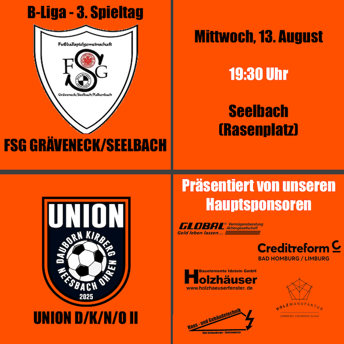Die Reserve der neuen Union Dauborn/Kirberg/Neesbach/Ohren muss bereits morgen, Mittwoch den 13.08.2025, bei der FSG Gräveneck/Seelbach zum vorgezogenen Spiel des 3. Spieltags antreten. Anstoß ist um 19:30 Uhr und gespielt wird auf dem Rasenplatz in Seelbach. Möglicherweise wird es ein Spiel auf Augenhöhe, obwohl man dies so früh in der Saison schwierig beurteilen kann. Die Union hat bisher 2 starke Spiele abgeliefert. Zum Saisonstart hat man mit einer guten kämpferischen Leistung beim TuS Drommershausen einen Punkt mitgenommen und am letzten Sonntag holte man nach einem 1:3 Rückstand gegen das Team der „Heimbel“ aus Oberbrechen ebenfalls noch einen Punkt. Gesamtbilanz somit nach 2 Spieltagen: 2 Punkte. Einen Zähler mehr hat der Gegner auf seinem Konto. Dem Team von Jan Rohletter gelang zum Saisonauftakt ein 3:1 Sieg zu Hause gegen Aufsteiger FSG Wirbelau/ Schupbach/Heckholzhausen II und zuletzt gab es eine 0:2 Niederlage beim TuS Linter. So steht es beim Torverhältnis schon mal Unentschieden. Sollte die Union II an die Leistungen der ersten beiden Spiele anknüpfen können, sollte am lauen Sommerabend in der Ferne etwas Zählbares durchaus drin sein. Schaun mer mal.