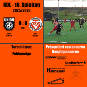 Der Rückrundenauftakt der Union misslingt. Würde man es mit Blick auf die derzeitige Politik ausdrücken wollen: Die Union mit schwachen Werten. Daher das Positive gleich zu Beginn – die Null stand, durch den besten Mann auf dem Platz, Oldie Björn Enderich im Abwehrzentrum der Union, endlich wieder einmal, doch nach vorne ging an diesem freundlichen Herbstsonntag leider nicht viel. Da auch von Seiten der Gäste nicht allzu viel nach vorne ging, stand es am Ende verdientermaßen 0:0 Unentschieden, welches die angereisten Gästefans wie einen Sieg feierten. Der RSV hatte sich diesen Punkt mit großen Einsatz und viel Leidenschaft auch mehr als verdient. Einen Treffer hätte in diesem mäßigen KOL-Spiel auch keine Mannschaft verdient gehabt. Die dicksten Möglichkeiten, überhaupt einen Treffer zu erzielen, hatten: 5. Minute, Jakob Dombach – trifft für die Union den Innenpfosten. Zwischen der 17. und 43. Minute 2mal Nils Wettengl – der aber zu unentschlossen vor dem Gästetor agiert und in der 67. Minute eine Doppelchance durch Dombach und Fries auf Seiten der Union – die aber im Gewühl des Fünfmeterraums an den zahlreichen Abwehrbeinen der Gäste scheitern. In den letzten 10 Minuten dann die Gäste sehr nahe am „Lucky Punch“. Zunächst zwingt Vasyl Stasiuk Union-Schlussmann Antoni Iglantowicz zu einer Glanztat (84.) und 4 Minuten später zieht Theo Stahl einen Freistoß von der 16er-Linie zu zentral auf das Gehäuse der Union. Wem dieser Punkt am Ende der Saison dann mehr bringt – schaun mer mal.