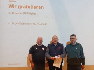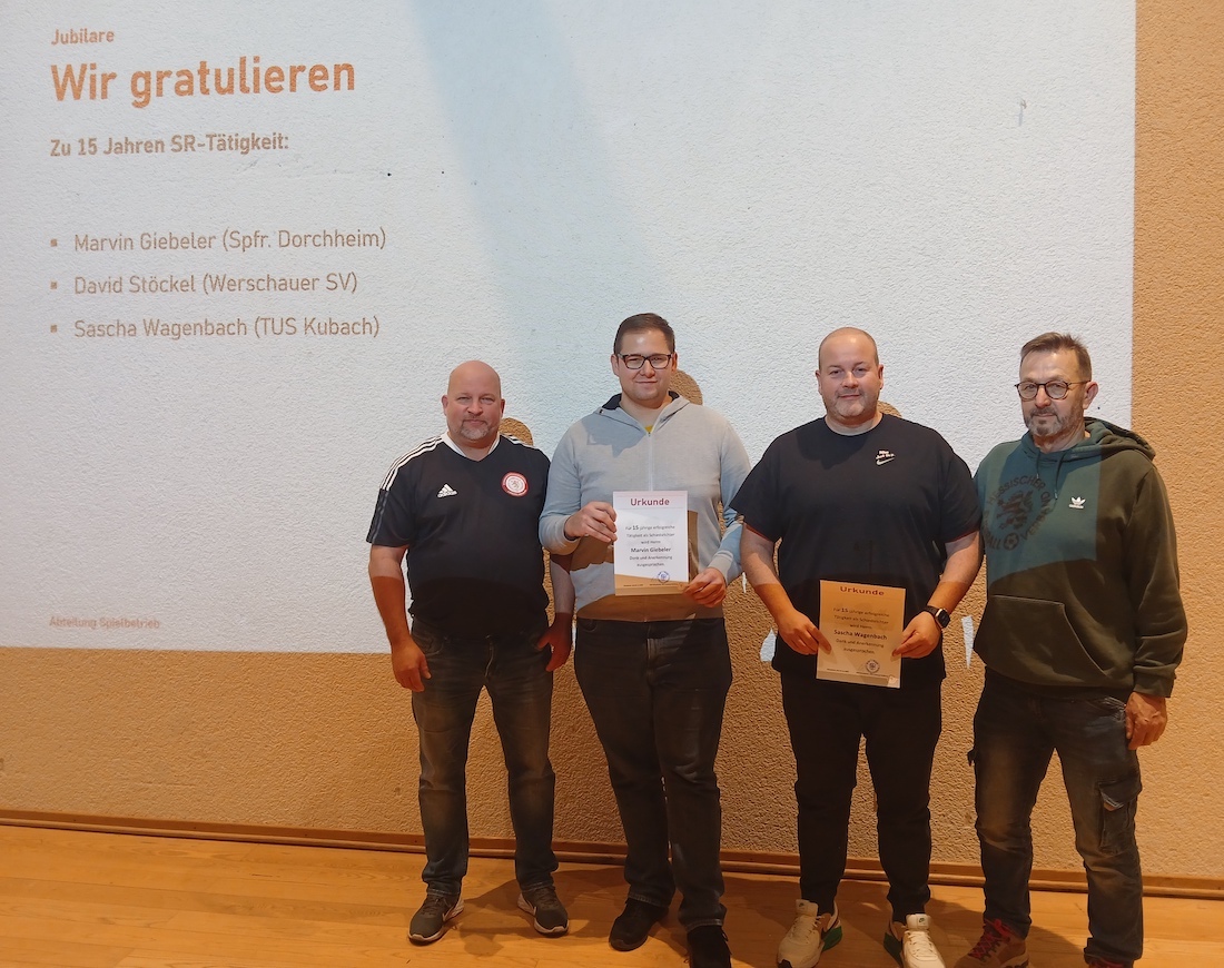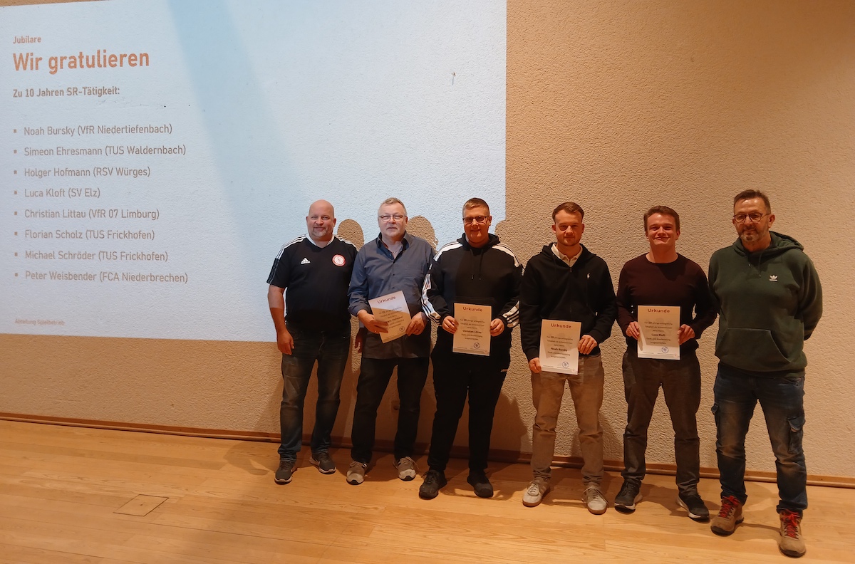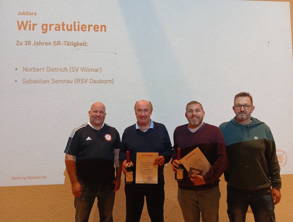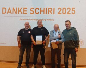 Highlight des Abends waren die Ehrungen. Hierbei wurden neben der Ehrung der Jubilare auch die beiden Sieger der Aktion „Danke Schiri“ ausgezeichnet, die an Menschen zuteilwerden soll, die sich besonders als Schiedsrichter verdient gemacht haben. In diesem Jahr fiel die Wahl in der Kategorie U50 auf Sascha Wagenbach, der sich neben seiner Zuverlässigkeit als eine große Stütze in der Nachwuchsarbeit auszeichnet. Die Stammvereine der SG Oberlahn etwa können eine Menge neue Jung-SR verzeichnen. An deren Gewinnung und der Kommunikation ist Sascha maßgeblich beteiligt.