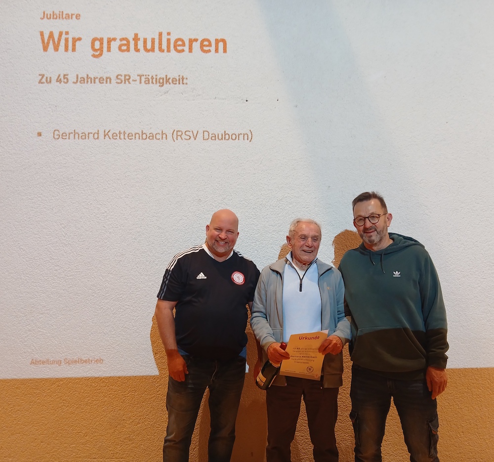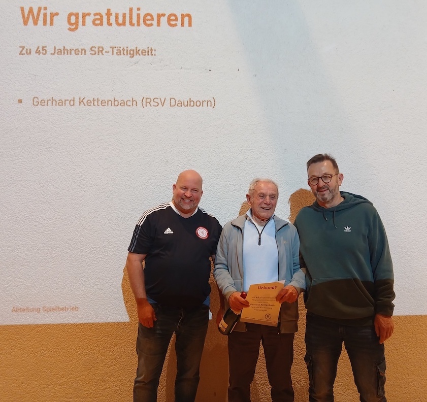 In der Kategorie Ü50 verneigen wir uns vor dem ältesten Schiri im Kreis, Gerhard Kettenbach. Gerhard feierte zudem das größte aller „Dienstjubiläen“ mit 45 Jahren Schiedsrichtertätigkeit. Die unfassbare Zahl an Spielen, die Gerhard im Laufe seiner Karriere gepfiffen haben muss, lässt sich nur schätzen, da Gerhards Schiri-Karriere bereits deutlich länger Bestand hat als die Datenerfassung im DFBnet.