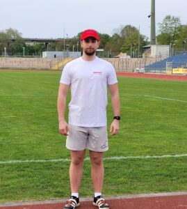 Auch Theodor Sauerwein (20 facher Deutscher Meister beim Deutschen Turnerbund und Deutschen Rasenkraftsport- und Tauziehverband und derzeit amtierender Deutscher Meister im Leichtathletik-Fünfkampf des Turnerbundes trägt unser Shirt  und unsere sport 11 – cap.