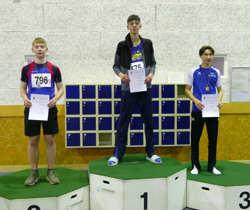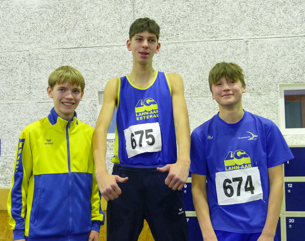 Max Holzhäuser und Till-Bjarne Thielmann (beide M14) starteten erstmals bei einer solchen Meister-schaft. Den 60 m-Vorlauf beendete Max in 8,79 s. Seinen ersten Wettkampf über die neuen Hürden-höhe und -abstände bestritt er gleich im Finale dieser Meisterschaft. In der Vorbereitung auf den Lauf hatte er sich bei einem Sturz eine sehr schmerzende Armverletzung zugezogen. Darüber geschockt traute er sich im Wettkampf keinen Dreierrhythmus mehr zu und lief als bester Läufer aus dem Rheinland in 10,72 s auf Platz 4. Auch im Kugelstoßen stand der erste Wettkampf mit der 4 kg an. Hier überraschte er mit einer Weite von 10,85 m, verfehlte als Viertplatzierter Platz 3 nur um 7 cm, vor ihm 3 Sportler aus Mainz. Till beendete den ersten Hürdenlauf unter den neuen Bedingungen in 11,48 s, Platz 5. Zu Beginn der Veranstaltung lief er erstmals 800 m auf einer 200 m-Hallenrundbahn. Deshalb konnte er mit 2:37,63 min als insgesamt Sechstplatzierter der 13 Starter in 2 Zeitläufen zu-frieden sein.