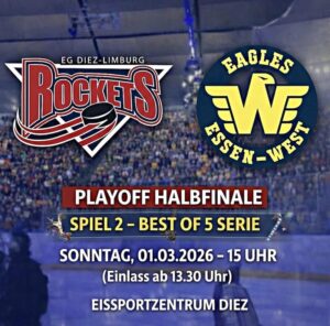Den ersten Schritt haben die Rockets mit einem Sweep im Viertelfinale gegen Bergisch Gladbach erfolgreich gemeistert. In der Runde der letzten Vier trifft die EGDL nun auf den absoluten Meisterschaftsfavoriten aus Essen. Der erste Puck der Serie fรคllt am Freitag, den 27. Februar 2026, um 20:00 Uhr am Westbahnhof. Zu Spiel 2 erwarten unsere Jungs die Eagles dann am Sonntag, den 01. Mรคrz 2026, um 15:00 Uhr am heimischen Heckenweg.