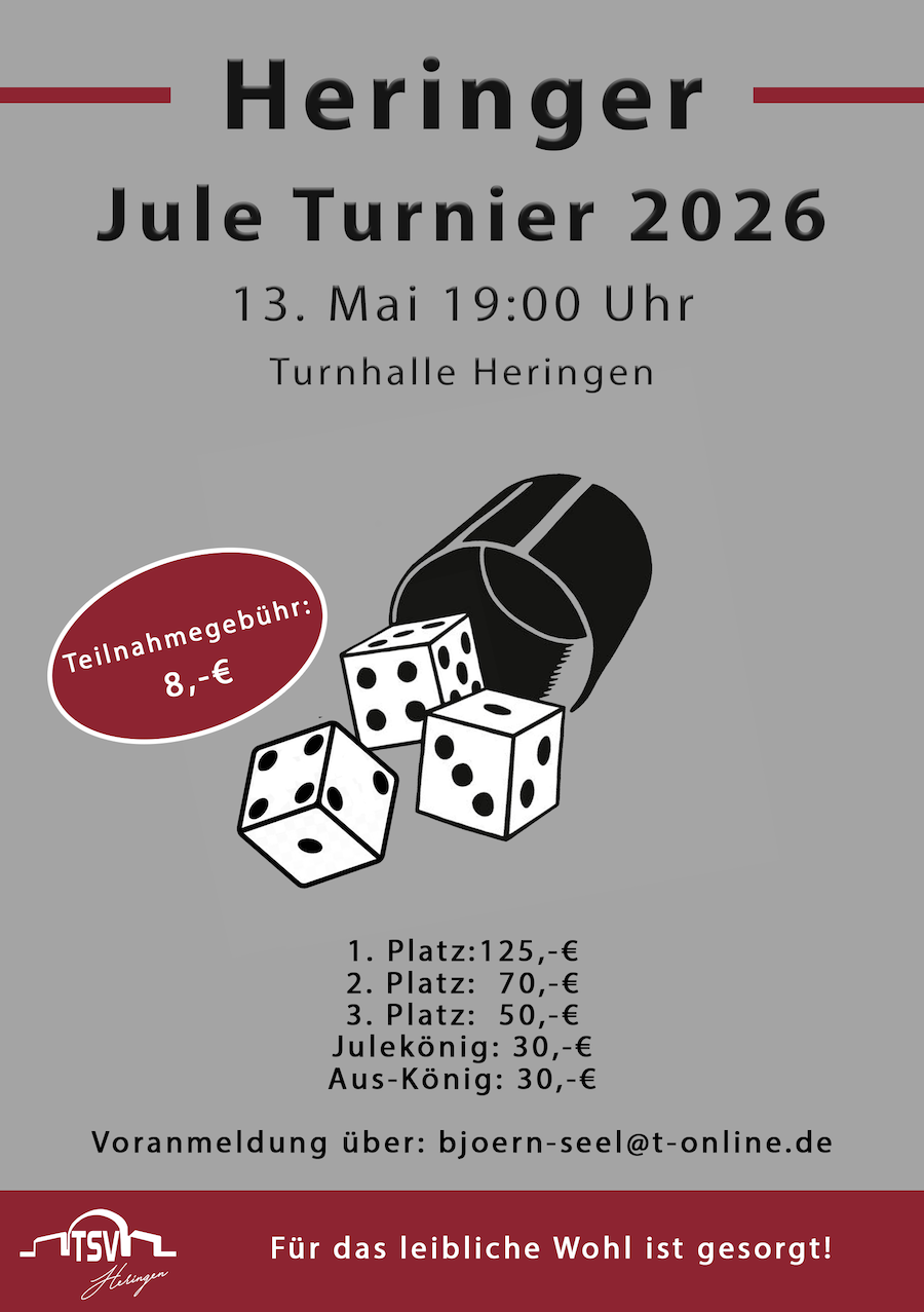 . Das Heringer Jule Turnier findet am 13. Mai um 19.00 Uhr in der Turnhalle Heringen statt.