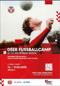 Vom 14.05. bis 17.05.2026 findet zum ersten Mal das 05er-Fußballcamp im Stadion „Goldener Grund“ in Würges statt. Mitmachen können alle fußballbegeisterten Kids von 6 bis 13 Jahren. Für alle Keeper gibt es zusätzlich ein spezielles Torwarttraining, das direkt bei der Anmeldung ausgewählt werden kann.